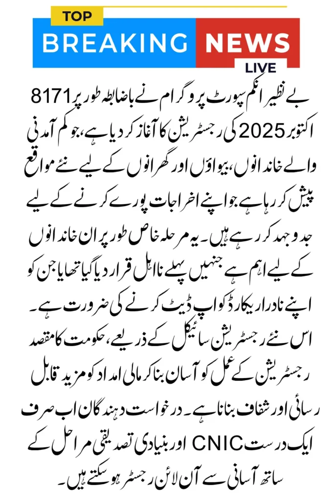 The Benazir Income Support Programme has officially opened the BISP 8171 October 2025 Registration, offering new opportunities for low-income families, widows, and households who are struggling to make ends meet. This phase is especially important for families who were previously marked ineligible or those who need to update their NADRA records.
